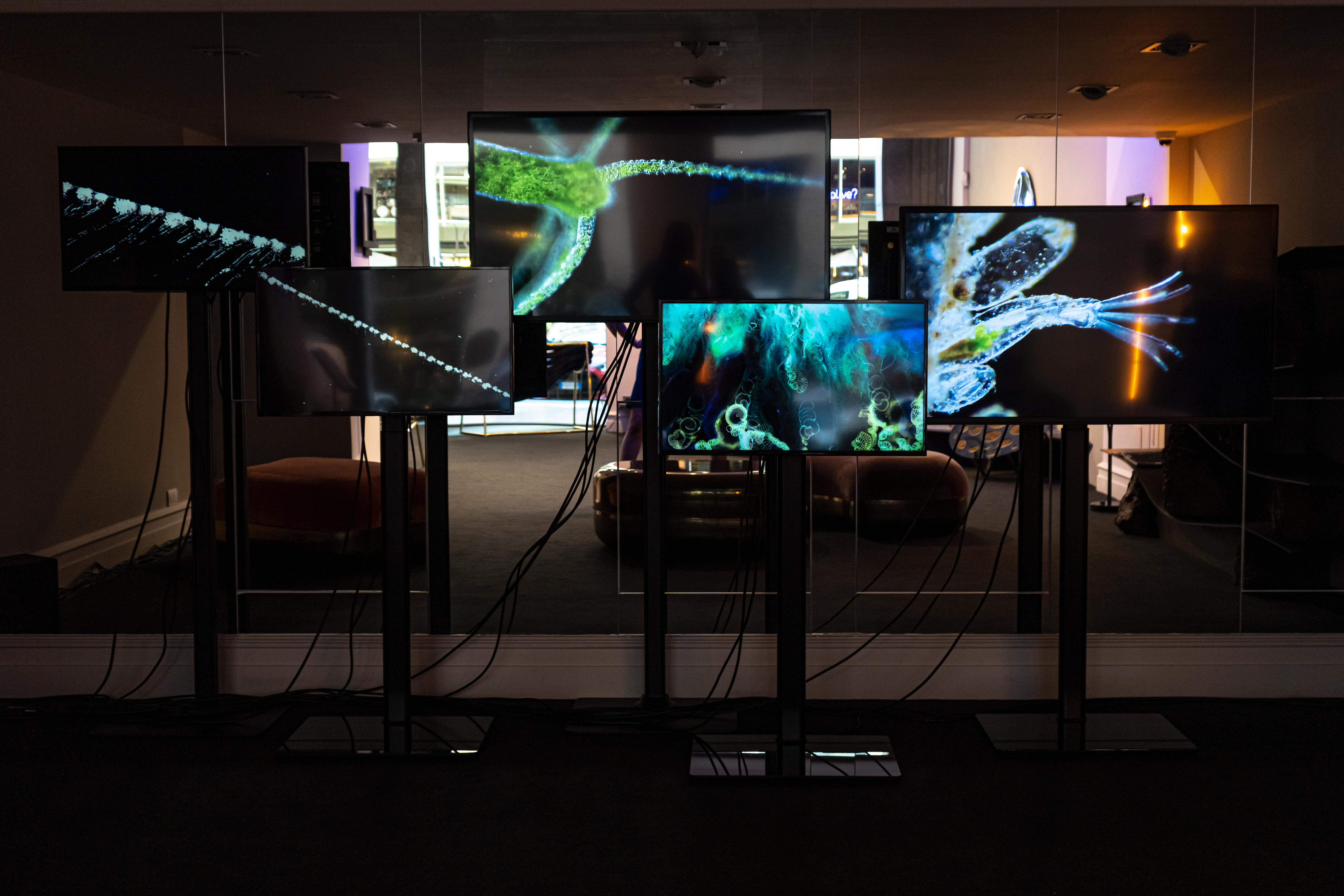 The exhibition ALTERNATE LIFEFORMS organised by CTRLZAK Studio questions the notion of ‘living’ by examining the infinite possible definitions of the concept of ‘life’. The video installation by the Kokoschka Revival collective, in collaboration with artist Thanos Zakopoulos, explores this notion beyond the anthropocentric concept of ‘life’ to reveal the complex intra-actions that occur between inanimate structures and micro-organisms. The installation consists of six wall screens. The videos show unusual life forms such as organisms living in the depths of the ocean, single-celled microorganisms, bacteria and inorganic systems. The six videos are controlled by a synchronised system to create a single visual tableau. This strategy allows for a kind of polyphony that highlights the trajectories in space of these organisms, creating a perceptual illusion of movement between screens. Within this framework, the treatment of the image aims to enhance the fictitious and anti-naturalistic dimension of these ecosystems by questioning the fact that ‘life’ is an exclusively human property. The real-time sonification of the image data (amount of movement, colour) also makes it possible to emphasise the ‘agentic’ dimension of these ‘alternative’ forms of life, whose vitality is also manifested acoustically. In this sense, the sound dimension reinforces the immersive and narrative dimension of the visual dramaturgy.